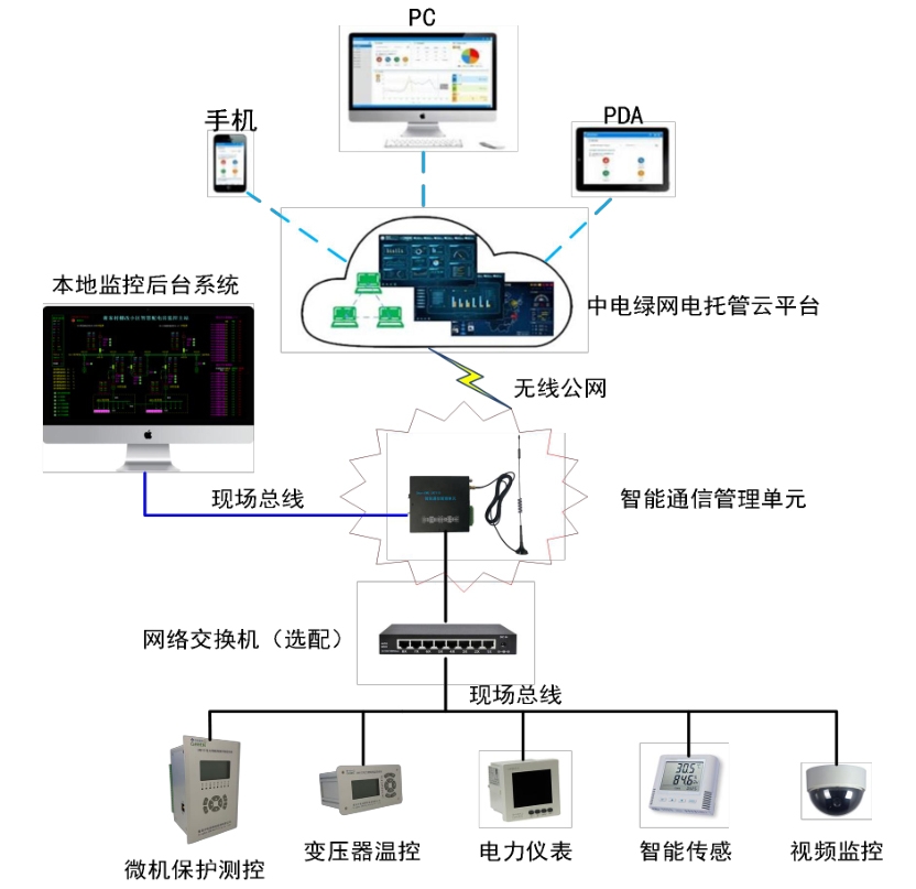 4. 【與云平臺系統(tǒng)通信】—— 通過 4G/5G 或者光纖通信方式與我公司的智能監(jiān)控運(yùn)維云平臺系統(tǒng)進(jìn)行通信,將現(xiàn)場采集的信息實(shí)時(shí)傳遞給云平臺,方便用戶對站所內(nèi)的設(shè)備進(jìn)行遠(yuǎn)程監(jiān)控。